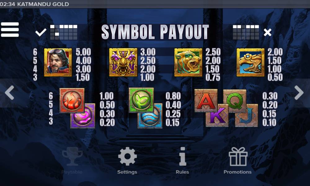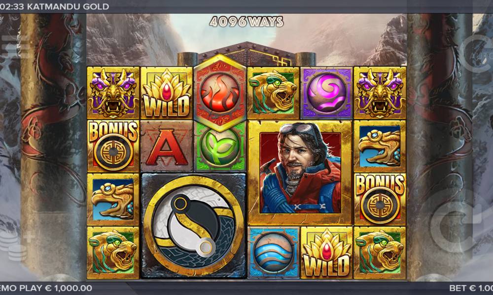 Il campo di gioco della slot Katmandu Gold del provider ELK Studios è rappresentato da una classica griglia 5x4. Tutti i pagamenti vengono effettuati solo su 4.096 linee.